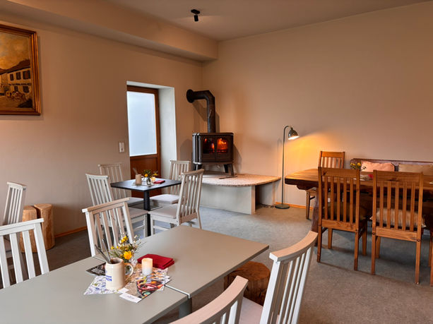 neuer Caféraum geöffnet; kommen Sie gern vorbei und genießen Sie ein Stück Kuchen und die wohlige Wärme vom Kaminofen.